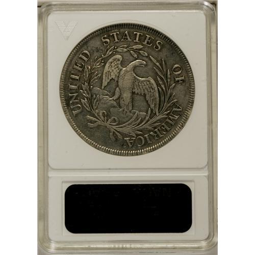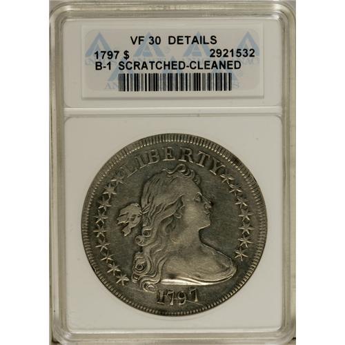 <B>1797 S$1 9x7 Stars, Large Letters--Scratched, Cleaned--ANACS. VF30 Details.</B></I> B-1, BB-73, R.3. A subdued stone-gray example with substantial inner detail within the wings and hair. A pinscratch between 5:30 and 7 o'clock crosses the date, but there are no other consequential abrasions.<BR><BR><b>Shipping:</b> Coin/Currency (<a target="_blank" href="http://www.heritageauctions.com/common/shipping.php">view shipping information</a>)