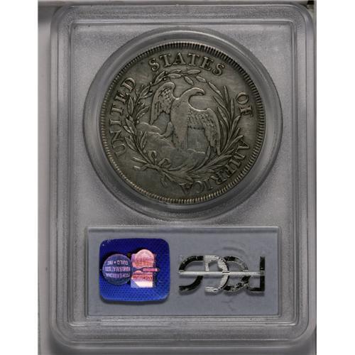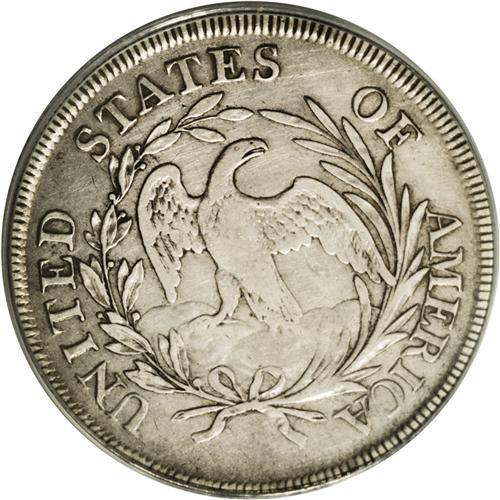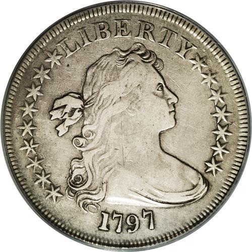 <B>1797<img border='0' src='http://www.heritagecoins.com/images/star.gif' width=10 height=10>$1> 9x7 Stars, Large Letters VF30 PCGS.</B></I> B-1, BB-73, R.3. This stone-gray Small Eagle Bust dollar retains impressive detail on the eagle's wings, and some breast feathers are also present. A couple of light vertical pinscratches are noted behind Liberty's ear, and the reverse field has inconspicuous clusters of faded, long-ago pinscratches.<BR><I>From The Long Beach Family Collection.</B></I>