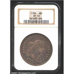 1797 S$1 9x7 Stars, Large Letters XF40 NGC.<p>B-1, BB-73. R-3. Die State II. This coin has medium gray toning over nice, problem-free surfaces. A few tiny planchet flaws can be observed in Liberty's hair, and a slight rim disturbance is noted above IB of LIBERTY.From the Michael Hering Collection. Important notice: We expect to be auctioning lots at the rate of 200-250 per hour. Sometimes eBay Premier live bid software cannot keep up with that pace, so we strongly recommend that you place a realistic proxy bid now as insurance to avoid disappointment. Also please note that all Heritage/CAA lots purchased through eBay Premier carry a 20% Buyer's Premium.