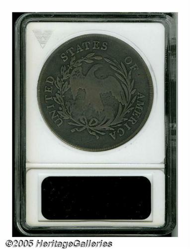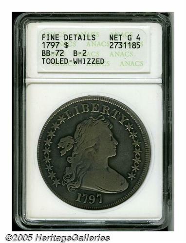 <B>1797<S$1> 9x7 Stars, Small Letters--Tooled, Whizzed--ANACS. Fine Details, Net Good 4.</B></I> B-2, BB-72, R.4. The surfaces impart a smooth appearance, partially as a result of the left side of the obverse being smoothed. A well centered example of this scarcer variety, desirable to both type and date collectors.