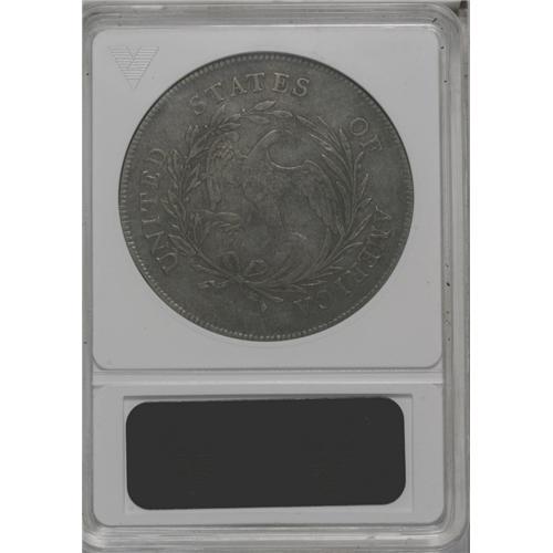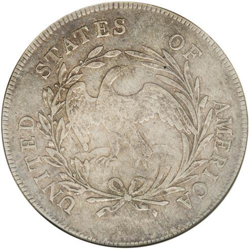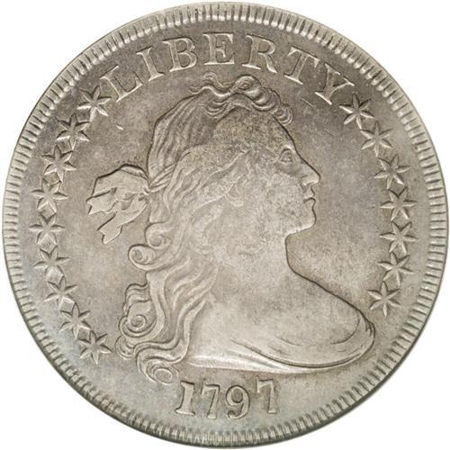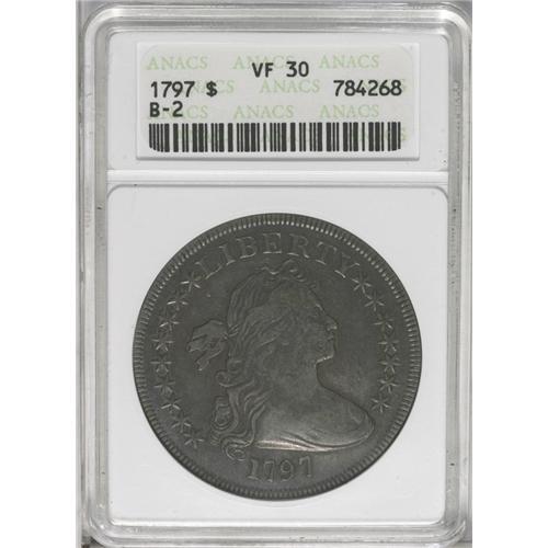 <B>1797<img border='0' src='http://www.heritagecoins.com/images/star.gif' width=10 height=10>$1> 9x7 Stars, Small Letters VF30 ANACS.</B></I> B-2, BB-72, R.4. The scarcest and most desirable of the three varieties of 1797 dollars, each of which receives a separate <I>Guide Book</B></I> listing. This example is deeply toned in midnight-blue and plum shades on the obverse, while the reverse is bathed in dusky golden-brown hues. Inspection beneath the patina does not reveal relevant marks. This nicely detailed piece should satisfy the advanced early dollar specialist.<BR><I>From The Royal Oak Collection.</B></I>