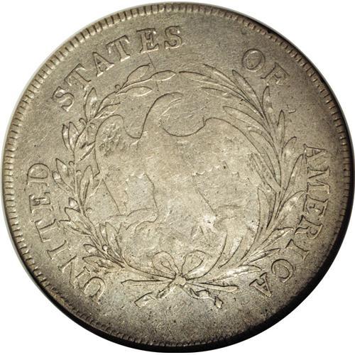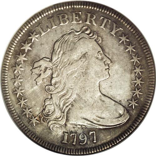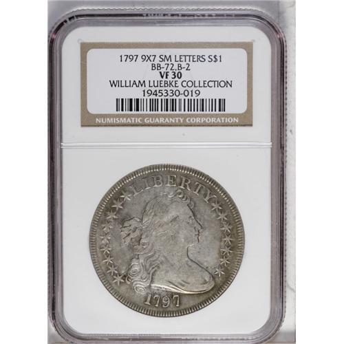 <B>1797 S$1 9x7 Stars, Small Letters VF30 NGC.</B></I> B-2, BB-72, R.4. Die State I. Seven stars right; paired berries below left side of first S. Only one die state is recorded by Bowers, indicating that no die wear took place during the coinage of this variety. Both sides have pleasing light gray color with considerable opaque gold toning along the obverse border. Minor obverse abrasions and faint reverse hairlines are visible. This is a scarce and highly desirable example, due in part to the fame it has garnered over the years from collectors and dealers who claimed it to be a major rarity. In the past, estimates of the number of examples known have been as small as just 20 coins, but the true population is probably in the range of 150 to 200 coins. This example from the Luebke collection is finer than most. Although a few high-quality pieces are known, nearly all examples of this die variety grade Fine or VF. The lower average grade is due in part to the nature of the reverse design, which was shallowly cut in the die and further diminished by die lapping or refinishing. The devices wore quickly with even a modest amount of circulation.<BR><I>Ex: Bowers and Merena (9/2002), lot 348.</B></I><BR><I>From The William Luebke Collection.</B></I><BR><BR><b>Shipping:</b> Coin/Currency (<a target="_blank" href="http://www.heritageauctions.com/common/shipping.php">view shipping information</a>)