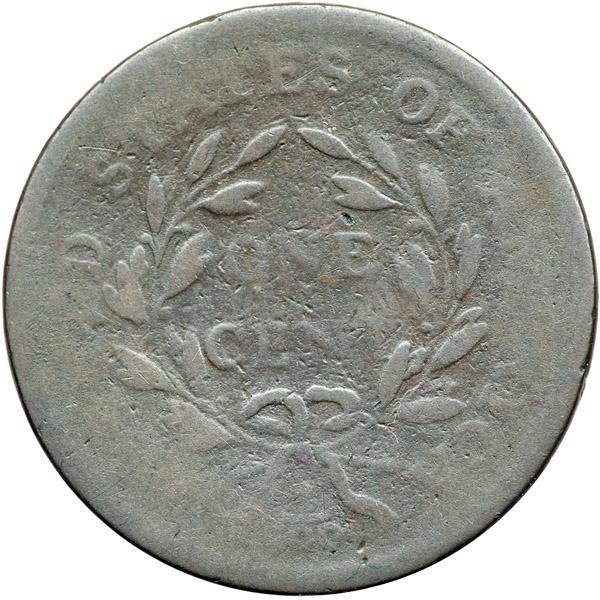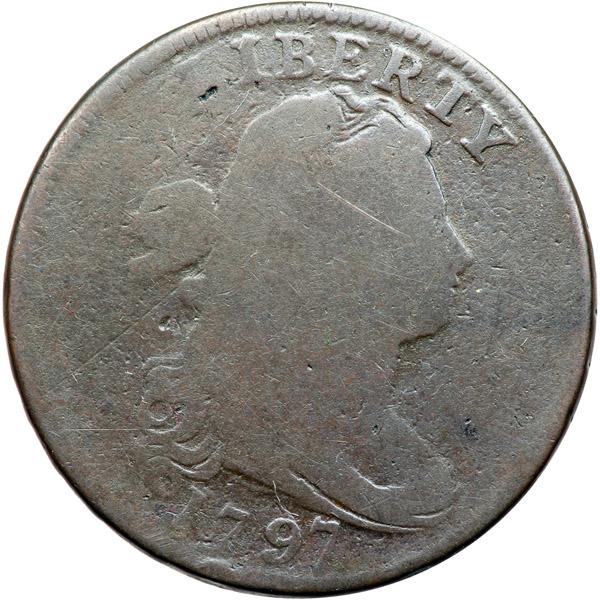 1797 S-120b R2 Reverse of 1796 with Gripped Edge G4. Glossy chocolate and light olive brown. No roughness or verdigris, just a few trivial marks. A small pit or planchet chip on the base of the L in LIBERTY is the only notable mark. The date is clear but portions of the reverse legend are weak. The "Gripped Edge" feature is strong.