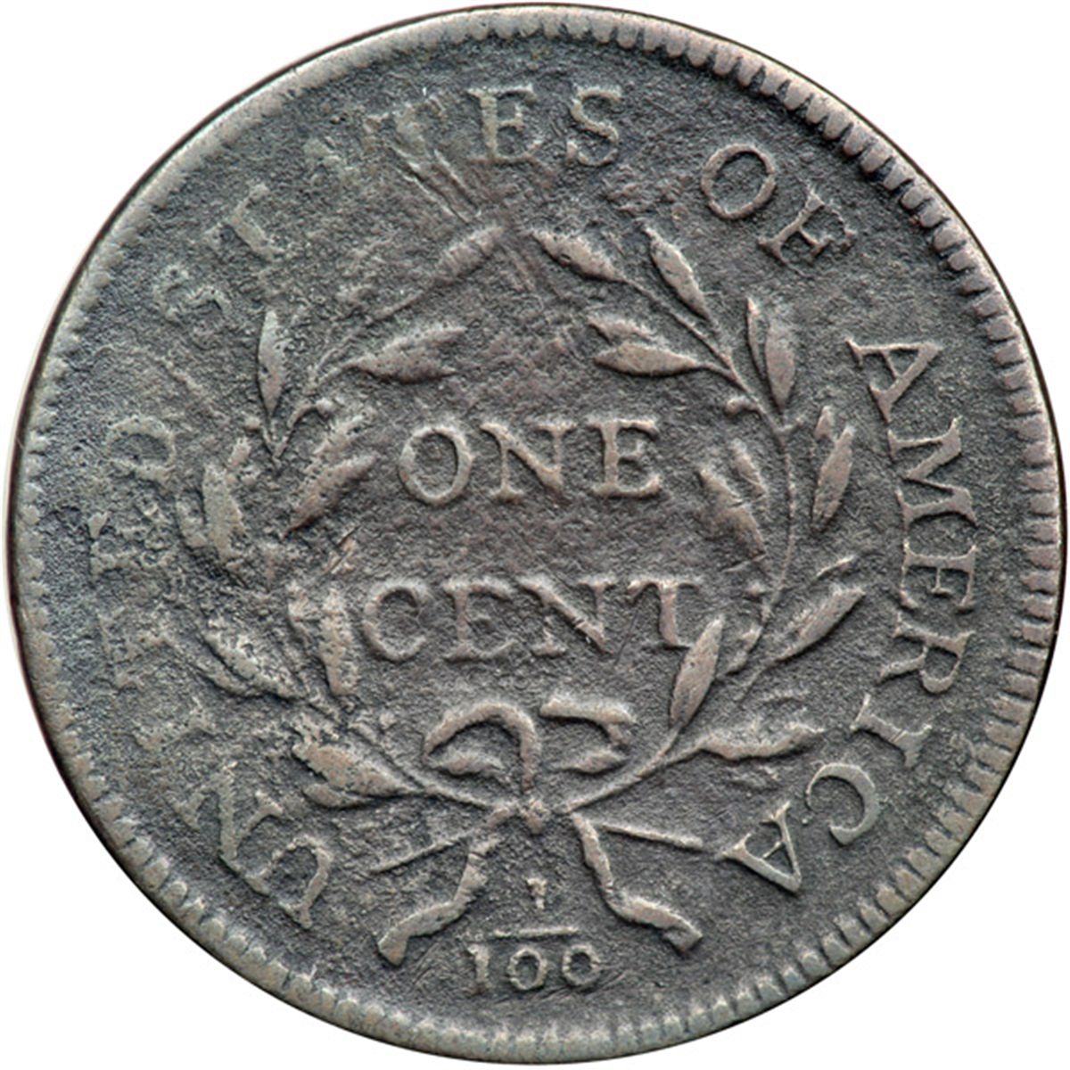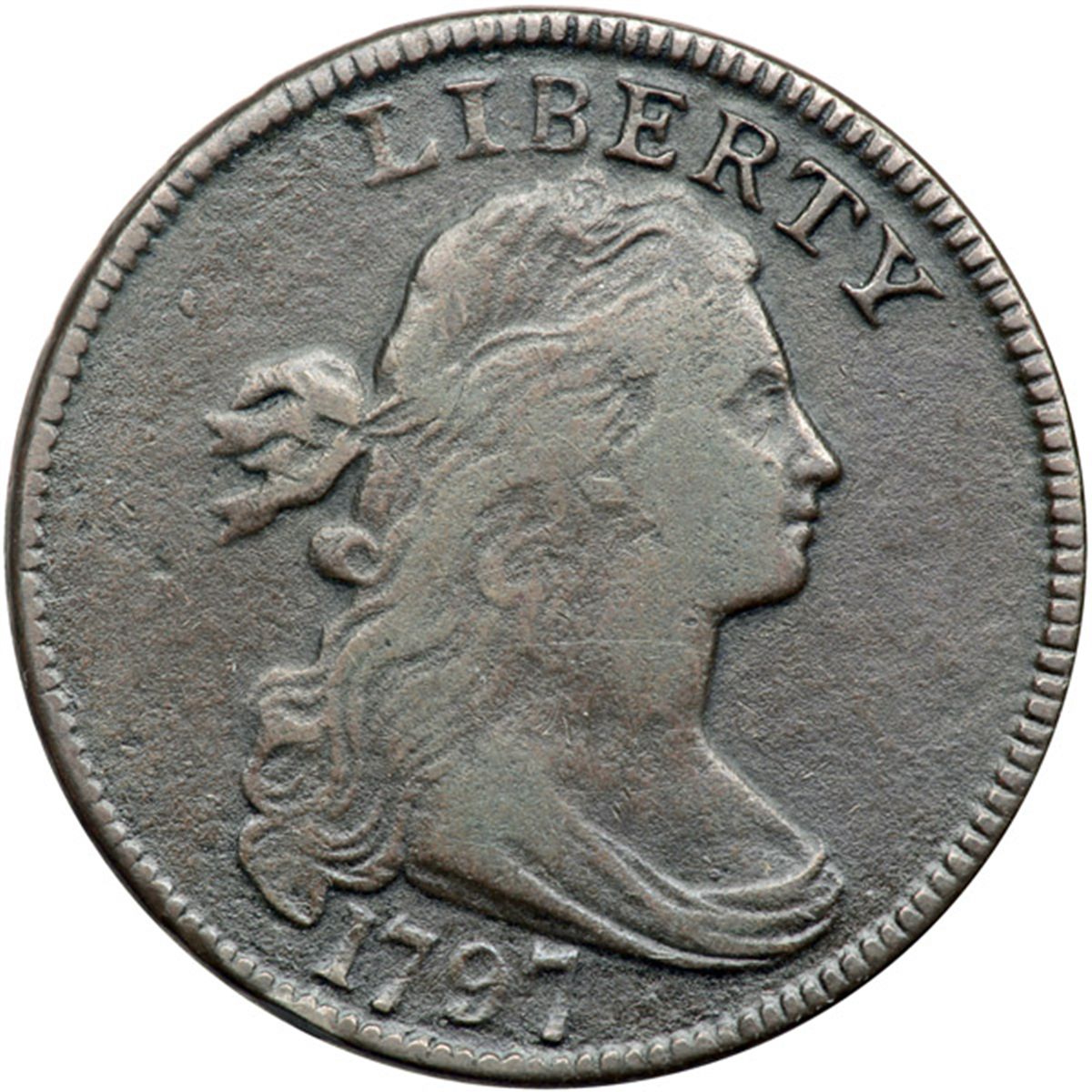 1797 S-121b R3- Gripped Edge VG8. Sharpness F15 but covered with fine to moderate roughness, strongest on the reverse. No verdigris and the only mark is a dull scratch down from the second T in STATES to the upper leaves of the wreath. The obverse offers nice eye appeal while the reverse is less attractive. Rather glossy chocolate brown with slightly lighter steel brown toning on the devices. The date is strong and the legends are complete. The grip marks on the edge are clear. EDS, before any die cracks on the obverse.