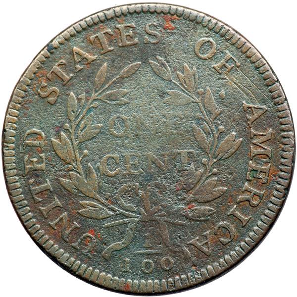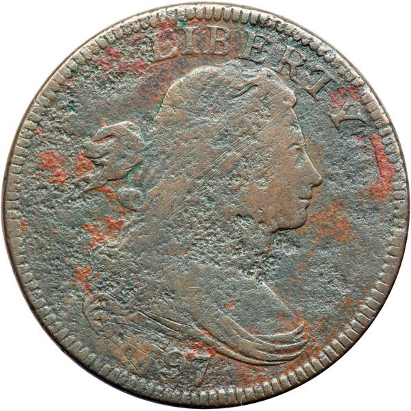 1797 S-124 R5+ G5. Sharpness VG10 or slightly better but lightly corroded with numerous patches of moderate porosity on the obverse. There are areas of shallow reddish brown scale on the obverse and a few specks of similar scale on the reverse. The notable contact marks are a few thin scratches at the 17 in the date and others at F-A. Slightly glossy chocolate and olive with the reddish brown scale mixed in on the obverse. The date and legends are complete and clear except for weakness at the 17 and NE in ONE. Not the most attractive cent in this sale, but the details are excellent for this rare variety.