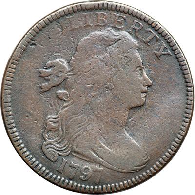 1797 S-125 R5. VG-10. A few points sharper but there are some faint hairline scratches on the portrait, all blending perfectly into the natural toning, plus a pinprick near the dentils behind the head and a dull nick under the first S in STATES. Glossy chocolate and steel with olive steel toning in protected areas on the reverse. The date and legends are complete and clear. EDS, Breen state I, with swelling on the bust tip and strong die clashmarks on the obverse.