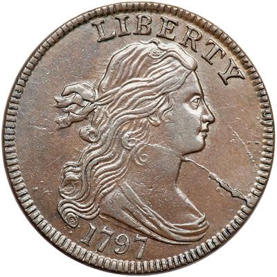 1797 S-126 R3 AU50+. AU-50 Plus. Breen Plate Coin. Choice glossy chocolate brown with underlying frosty mint luster in protected areas. Flawless surfaces with outstanding eye appeal, perfect for the grade. M-LDS, Breen state V. A strong die crack from the rim before the neck extends through the neck well into the hair at left. Called AU55 choice and tied for finest known honors in the Noyes and Bland census lists, Noyes photo #22927. The light wear suggests an AU50 grade, but the outstanding eye appeal could easily justify an additional 5 points. This is the Breen plate coin for the variety (the large photos). DWH #2539.