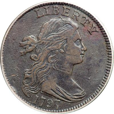 1797 S-126 R3. PCGS graded VF-25. Attractive glossy chocolate brown. The surfaces are smooth and very attractive except for a patch of extremely faint roughness at the Y in LIBERTY and some similar roughness in the field under the hair ribbon. A pair of faint horizontal hairline scratches across the neck and a barely visible nick hidden in the hair right of the ribbon are the only contact marks. Rare EDS, Breen state II. Clear die clashmarks show on both sides but the obverse is uncracked. Our grade is VF20 net F15+ for the microscopic roughness. Comes in an old PCGS holder with a green label.