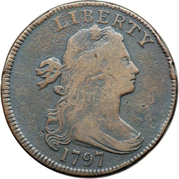 1797 S-127 R4 VG8. Mostly glossy chocolate brown with darker olive and steel toning in the protected areas. No roughness or verdigris, only a few light rim bruises on the obverse, strongest before the face. The date is bold and the legends are strong except for weakness at CENT. EDS. Excellent eye appeal for the grade.