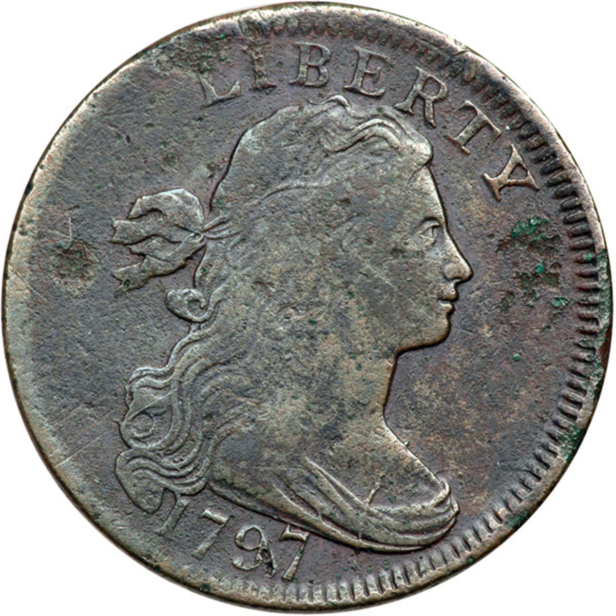 1797 S-128 R3 M over E in AMERICA VG8. Sharpness F12 or slightly better but there are a few patches of shallow corrosion and pitting on both sides, particularly at the rims over LI in LIBERTY, NI in UNITED, and TA in STATES. Specks of greenish verdigris accompany the rough patches. No significant contact marks other than a nick between the 9 and 7 in the date. Rather glossy reddish chocolate brown and darker olive with lighter brown toning on some of the devices. The date is bold and the legends are strong, including the M over E error in AMERICA. MDS.