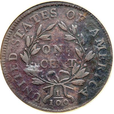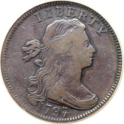 1797 S-128 R3. SEGS graded VF-20. M over E in AMERICA variety. The obverse is uniform glossy chocolate brown offering smooth, nearly flawless surfaces. The reverse is a blotchy mix of chocolate, olive, and reddish chocolate brown tones with traces of microscopic roughness in a few places. No contact marks or other notable defects. Nicely struck E-MDS, Breen state III. The M over E error is obvious. Our grade is VG10.