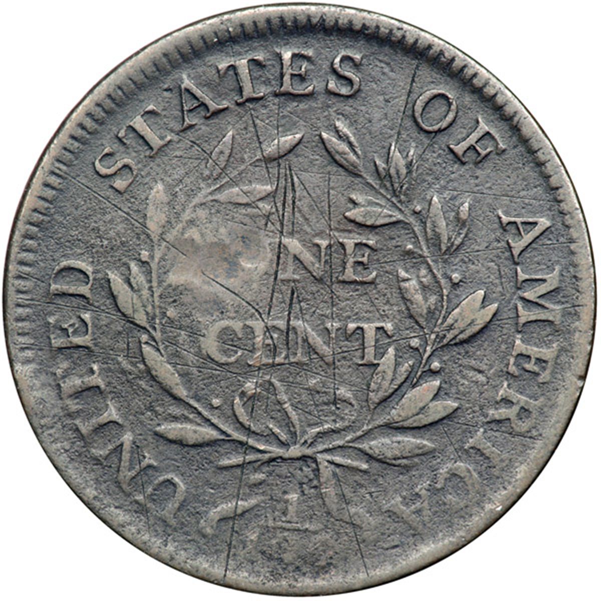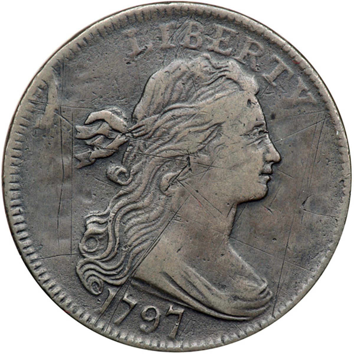 1797 S-130 R2 VG7. Sharpness F15 or a bit better but there are fine scratches on both sides, strongest in the center of the reverse, and the scratches in the obverse fields and on the neck have been smoothed. All the scratches are old and blend nicely into the attractive glossy chocolate brown and steel toning. No corrosion or verdigris. The date is bold and the legends are complete except for the O in ONE, which is faint.
