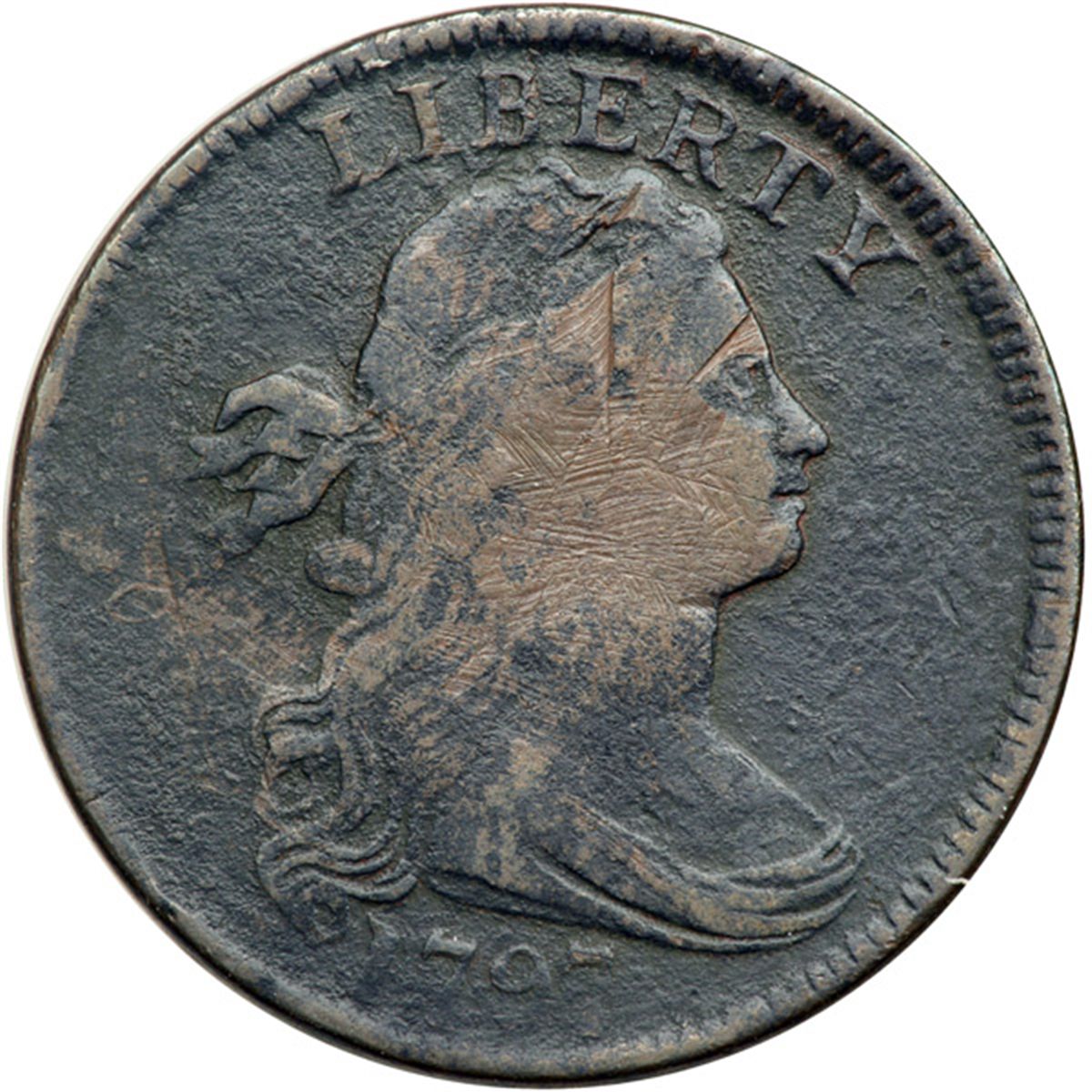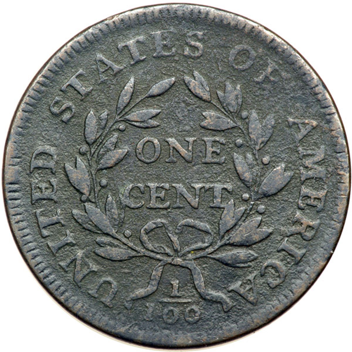 1797 S-132 R5+ Stemless Wreath G5. Sharpness VG10 but covered with fine roughness and the face of Ms Liberty has been crudely scraped. Not the most attractive cent but the date and legends are complete and easily readable, including the Stemless Wreath feature. Slightly glossy dark olive and steel.