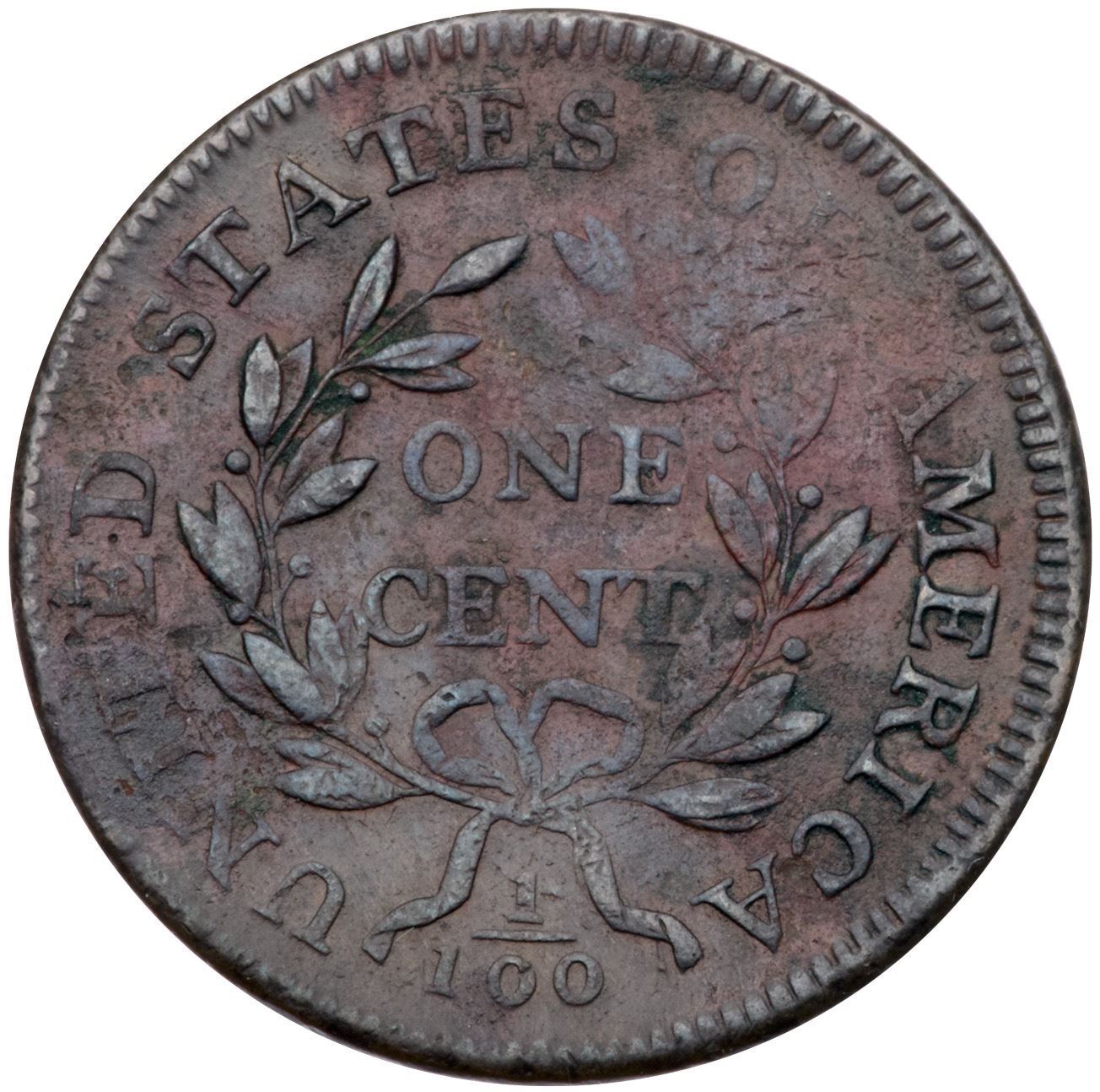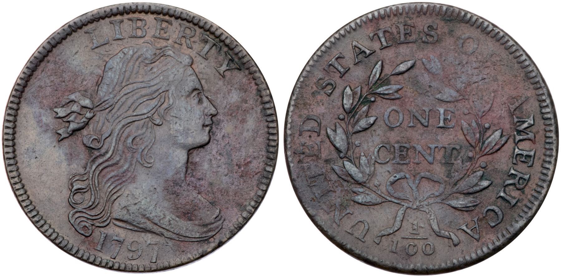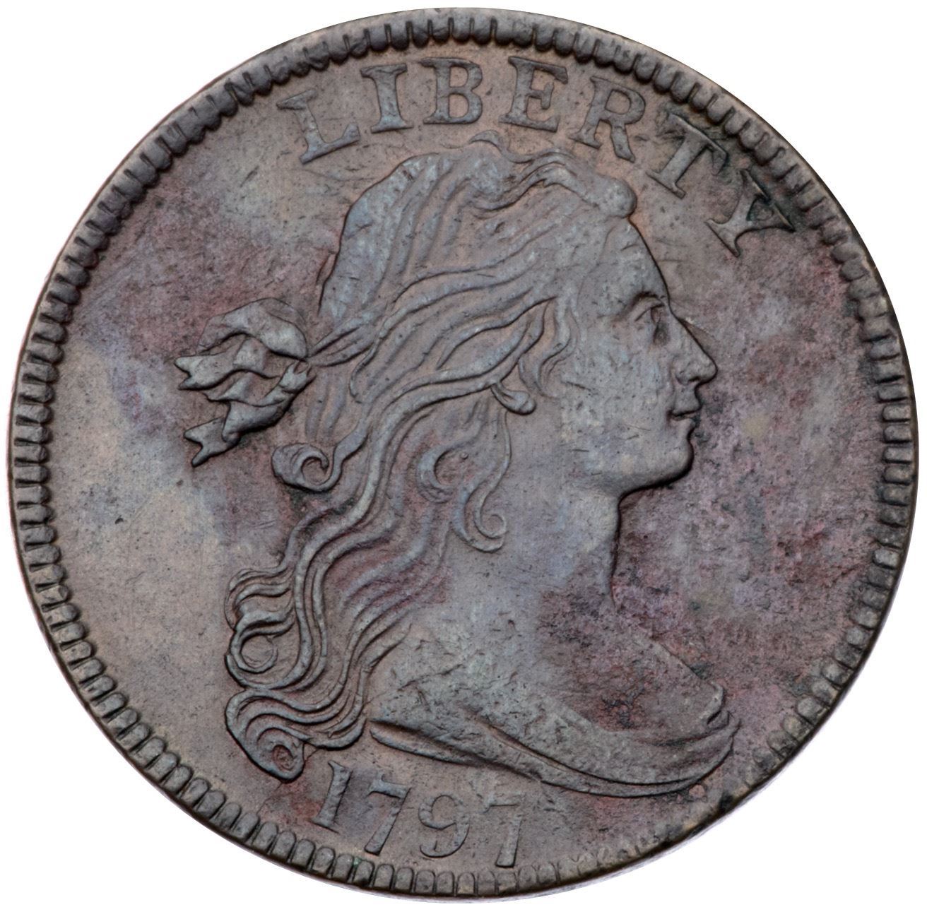 1797 S-133 R5 Stemless Wreath VF20Sharpness EF45 with areas of fine corrosion on both sides, strongest on the right side of the obverse and at NITE on the reverse. There are traces of verdigris in the roughened areas and just trivial contact marks that are lost in the roughness. Partly glossy mix of olive brown, steel, and reddish brown. LDS, Breen state V, with a radial die crack to the bottom of the neck and strong die clashmarks. Graded AU50 net VF20 and tied for CC#5 in the Bland census. Noyes says AU50 net VF20 and tied for CC#4, his photo #26329.Certificate Number: Pedigree: Ex Stack's 5/4/1979:52 (as XF)-Larry Stack (privately) 9/26/1980-C. Douglas Smith-Fred H. Borcherdt Collection (includes the Stack's sales ticket)