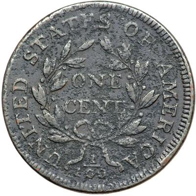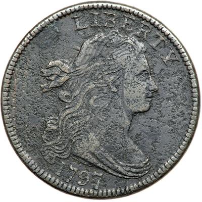 1797 S-133 R5. VG-10. Stemless Wreath. Sharpness VF30 or slightly better (which is quite sharp for this variety) but both sides are covered with fine corrosion that borders on moderate in a few places. No verdigris, and the only contact mark is a dull scratch that arcs from the throat into the hair where it fades out over the ear. Dark steel and olive. MDS, Breen state III, before the die crack from the dentils to the neck. The date and legends are strong.