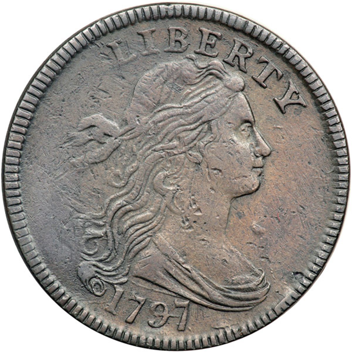 1797 S-134 R4 VG10. Ten points sharper but marked up a bit with small nicks on the portrait and some faint hairline scratches on both sides. Lightly cleaned and retoned a rather glossy olive and chocolate brown blending to lighter brown in a few places. M-LDS with a slightly raised retained cud break over the E in AMERICA. The date is bold and the legends are complete.