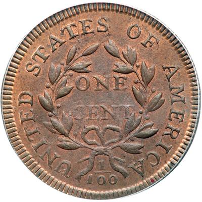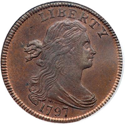 1797 S-135 R3. PCGS graded MS-64 Red & Brown. Frosty steel brown and light olive faded down from original mint red, at least 10% of the red remaining on both sides. No spots or stains. The only marks are pre-striking planchet chips that didn't completely smooth out as the coin was being struck. These microscopic chips, which are usually found to some degree on nearly all examples of this die variety, cover much of the portrait and the area inside the wreath. The only notable planchet chip is a tiny one in the field well left of the base of the L in LIBERTY. MDS, Breen state III. Almost certainly from the famous Nichols Hoard of mint state Draped Bust cents that was dispersed by the Nichols family of Massachusetts in the 1860's. Our grade is MS62. Pop 2; 7 finer, 4 in 65RB, 3 in 66RB.