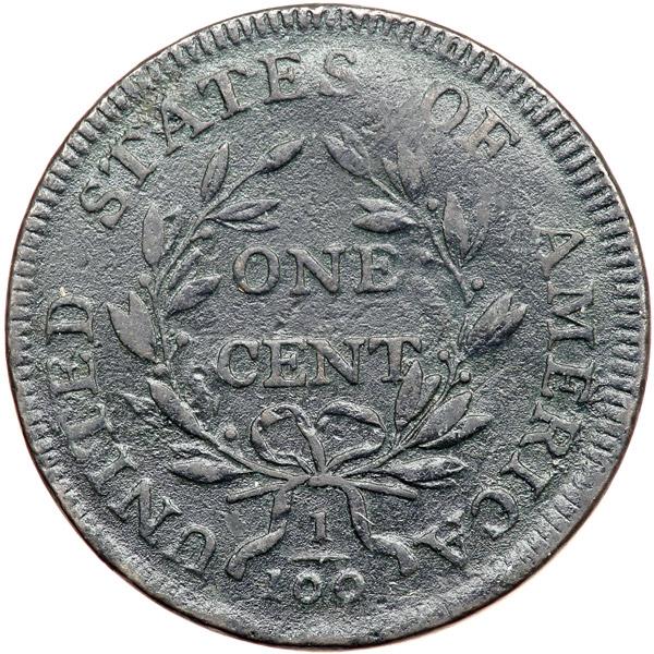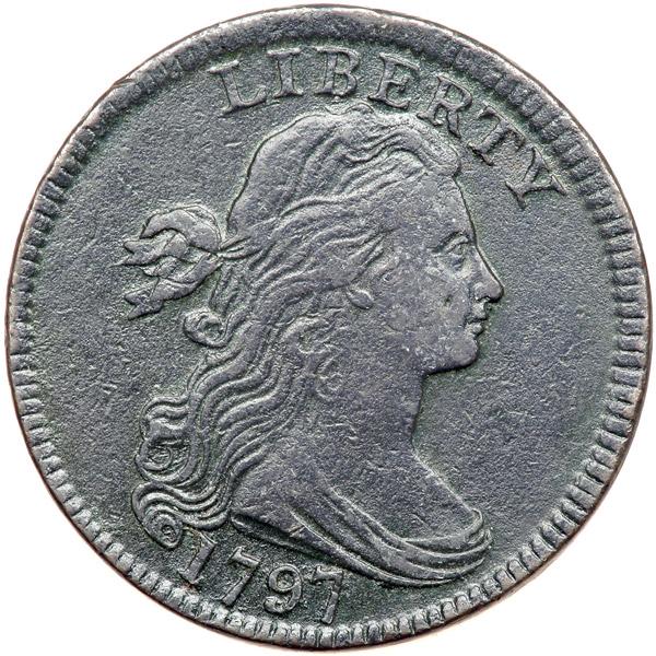 1797 S-138 R1 F15. Sharpness EF40 but covered with very fine roughness under a glossy dark olive and steel patina. Traces of greenish verdigris show in some of the protected areas but there are no significant marks. The date and legends are strong. MDS with obvious swelling at ES-OF-AM.
