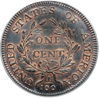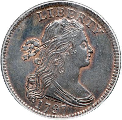 1797 S-138 R1. PCGS graded MS-66 Red & Brown. Highly lustrous bluish steel brown with 10% of the original bright mint color remaining on the obverse, at least 20% on the reverse. Flawless surfaces, a superb gem in every respect offering outstanding eye appeal. LDS, Breen state VIII. There are numerous light die cracks on both sides and minor swelling in the obverse fields. Called MS65 by Noyes and Bland, alone as finest known in the Bland census and tied for finest known honors with the ANS Museum example in the Noyes census, his photo #21491. Our grade is MS65+. PCGS Population 1; The only example graded at PCGS for the variety. DWH #2823.