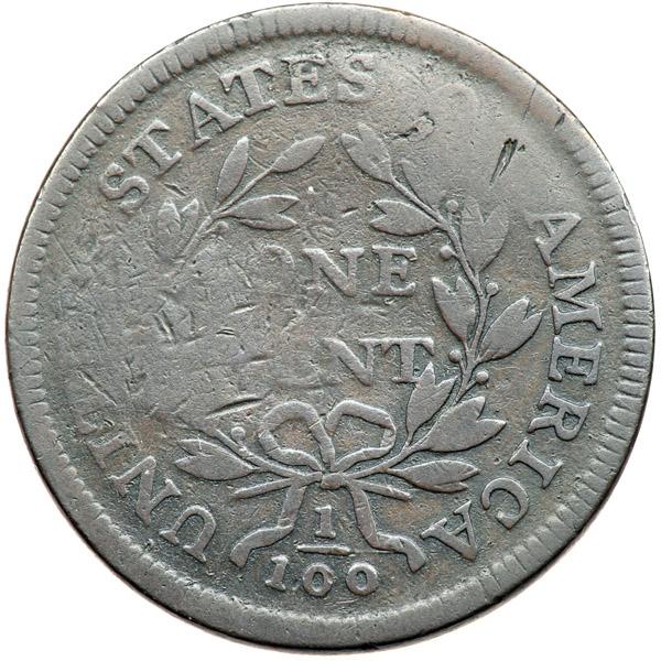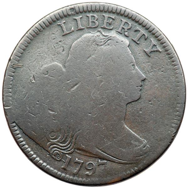 1797 S-139 R1 G6. Glossy chocolate brown. No roughness, just a few nicks on both sides, the strongest one at the F in OF. LDS with strong swelling and die cracks that obliterate the hair details under the ribbon with associated weakness at the bust tip, ITED, and OF. Otherwise the date and legends are strong.