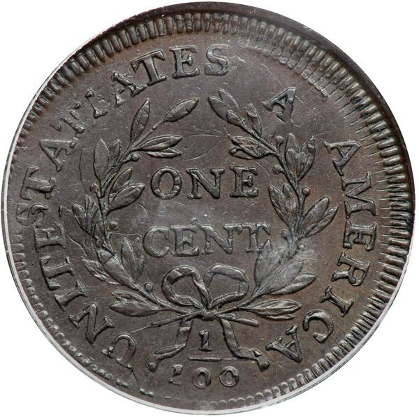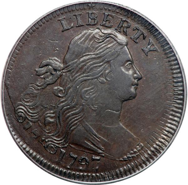 1797 S-139 R1 PCGS graded AU58. Double Struck Slightly Off Center with Rotation. Choice glossy chocolate brown with very attractive surfaces. Nearly flawless. The only marks are a couple tiny pinpricks in the field behind the head and another close over the right top of the E in CENT. Boldly double struck. The first strike was 5% off center to K-10 while the second was centered on the planchet and rotated 30 degrees CCW relative to the first impression. Much of the date from the first strike is clearly visible left of the second date. Additional strong evidence of the first strike shows on both sides, and the legend outside the wreath reads "UNITEDSTATTATES A AMERICA". M-LDS, Breen state IV, with die cracks and minor swelling on both sides. A beautiful cent and a remarkable mint error. Our grade is EF40+, close to EF45. The PCGS label mentions the error and calls it "Double Struck in Collar".