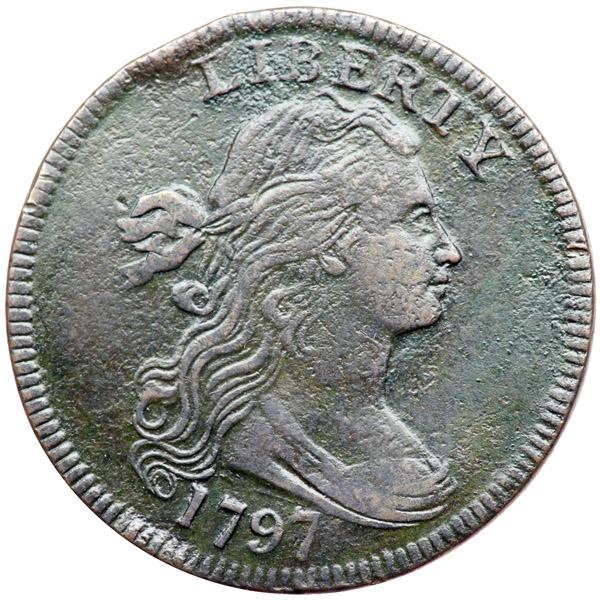 1797 S-140 R1 VG10. Sharpness VF30 with fine roughness under a glossy dark greenish olive patina. A rim bruise at the L in LIBERTY is the only notable mark. Later die state with a strong crack and swelling in the field left of the hair and lighter swelling at S-OF-A. The date is bold and the legends are strong.