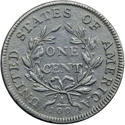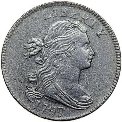 1797 S-141 R4+. VF-20. Sharpness at least EF40 but covered with uniform very fine porosity under a rather glossy very dark steel and olive patina. No verdigris. The only marks, and they are trivial, are a very tiny rim bruise over the left edge of the E in LIBERTY and a tiny rim nick under the 1 in the denominator. Nicely struck M-LDS, Breen state III. The die crack up through the ribbon end left of the fraction is clear. Called net VF25 by Noyes and Bland. Tied for CC#7 in the Bland census. Noyes has this one tied for CC#5 in his arrangement, photo #28817. Removed from an NCS slab graded AU Details Corroded (NCS label included). DWH #2560.