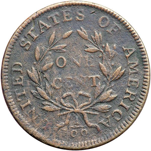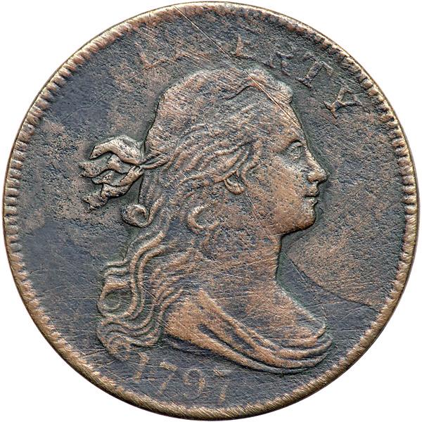 1797 S-141 R4. VG-10. Sharpness VF30 but covered with fine granularity. No verdigris, but both sides are covered with myriad very fine hairline scratches. A pinprick left of the O in OF is a good identifying mark. Slightly glossy dark olive with lighter chocolate brown toning covering the highpoints. M-LDS, Breen state III, with a vertical die crack through the wreath under C in CENT. The date and legends are complete and easily readable.