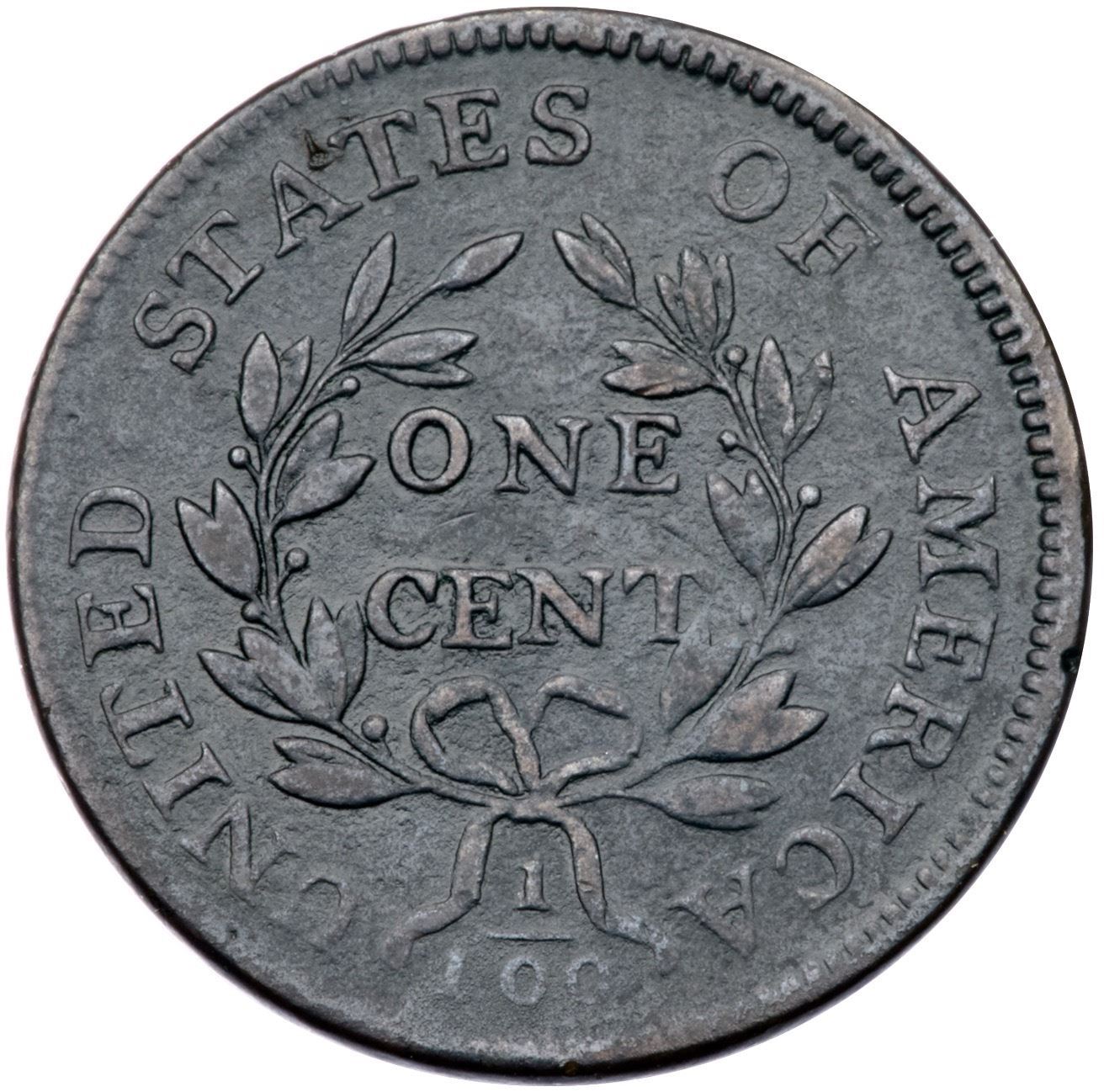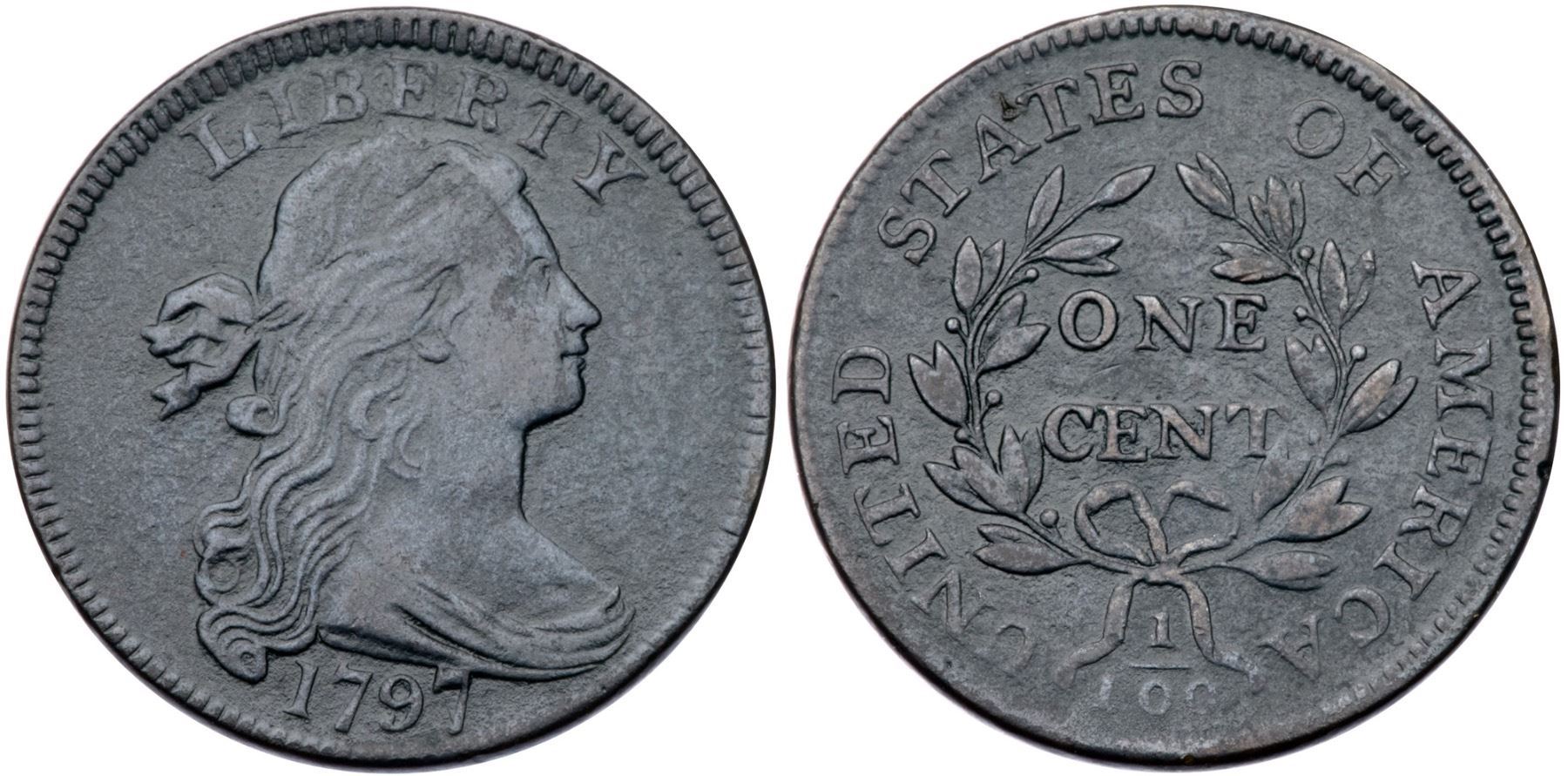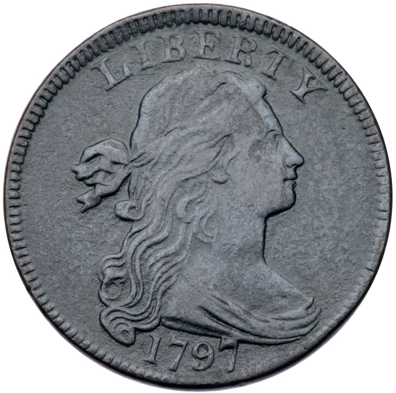 1797 S-143 R5 Stemless Wreath F12Sharpness VF25 but the fields and protected areas are covered with very fine roughness under rather glossy dark olive brown toning. No verdigris or marks. MDS. Graded VF25 net F12 and tied for CC#15 in the Bland census. Noyes says VF25 net F12 and tied for CC#11, his photo #27511. Comes with a nice provenance.Certificate Number: Pedigree: Ex Charles J. DuPont, Stack's (Anderson DuPont Collection Sale) 9/24/1954:179-Dorothy I. Paschal-Wilson, 1967 ANA Sale (Paramount International Coin Corp.), lot 199 (as VF+)-Dr. Hiram T. Ward-Fred H. Borcherdt Collection (includes the Paschal collection envelope)