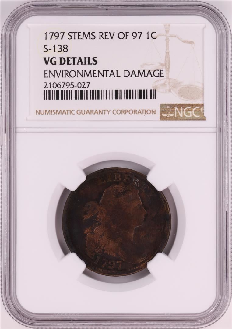 One 1797 Stems Reverse of 97 S-138 Draped Busted Large Cent Coin NGC VG Details. NGC Certified.