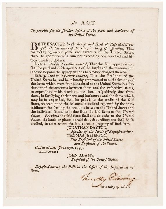 1797 ACT of Congress Approved by President John Adams & VP Thomas Jefferson Hand Signed By “Timothy Pickering, Secretary of State “for the Defense of the Ports and Harbours of the United States.”