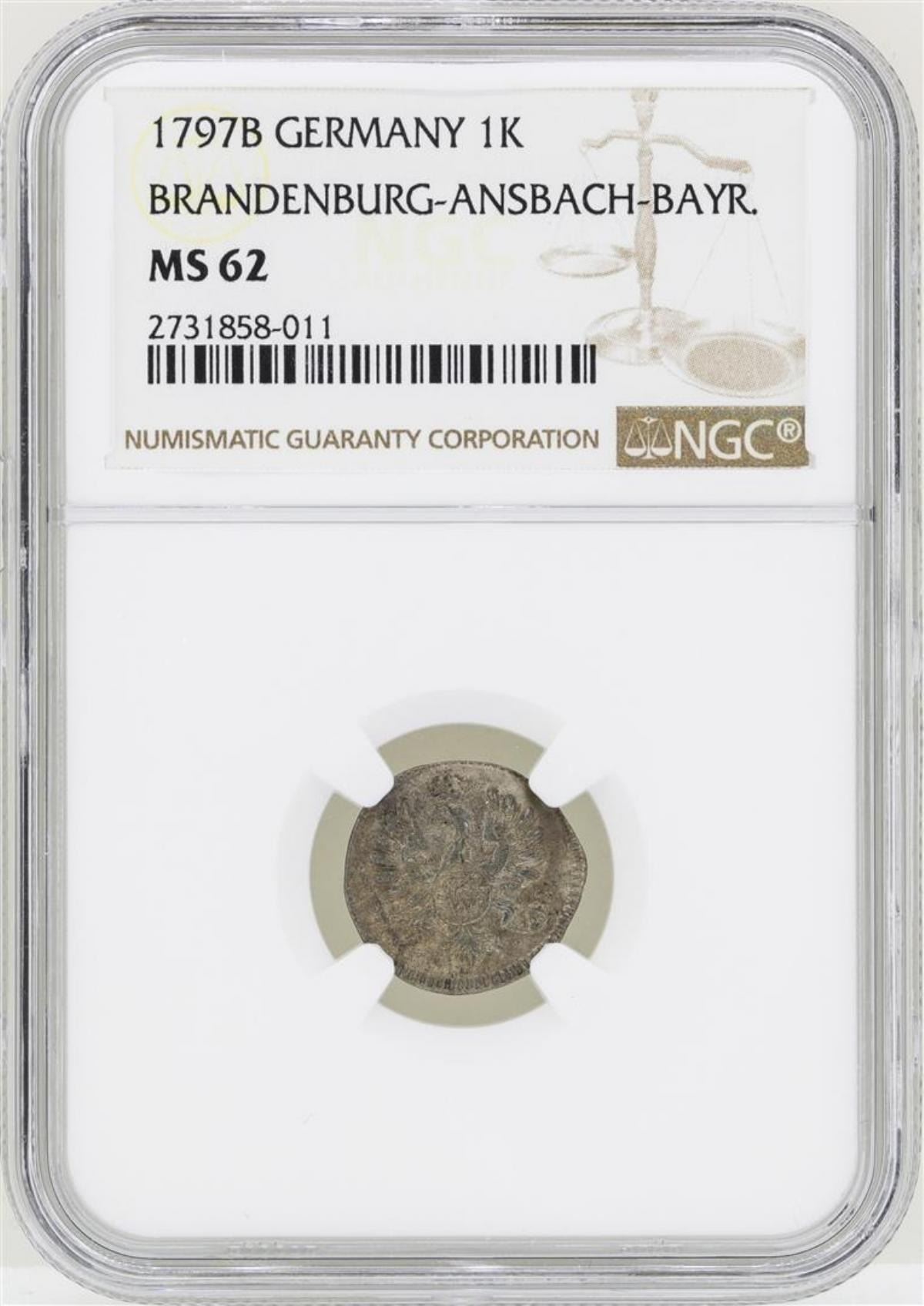 One 1797B Germany Kreuzer Brandenburg-Ansbach-Bayr Coin NGC MS62. NGC Certified.