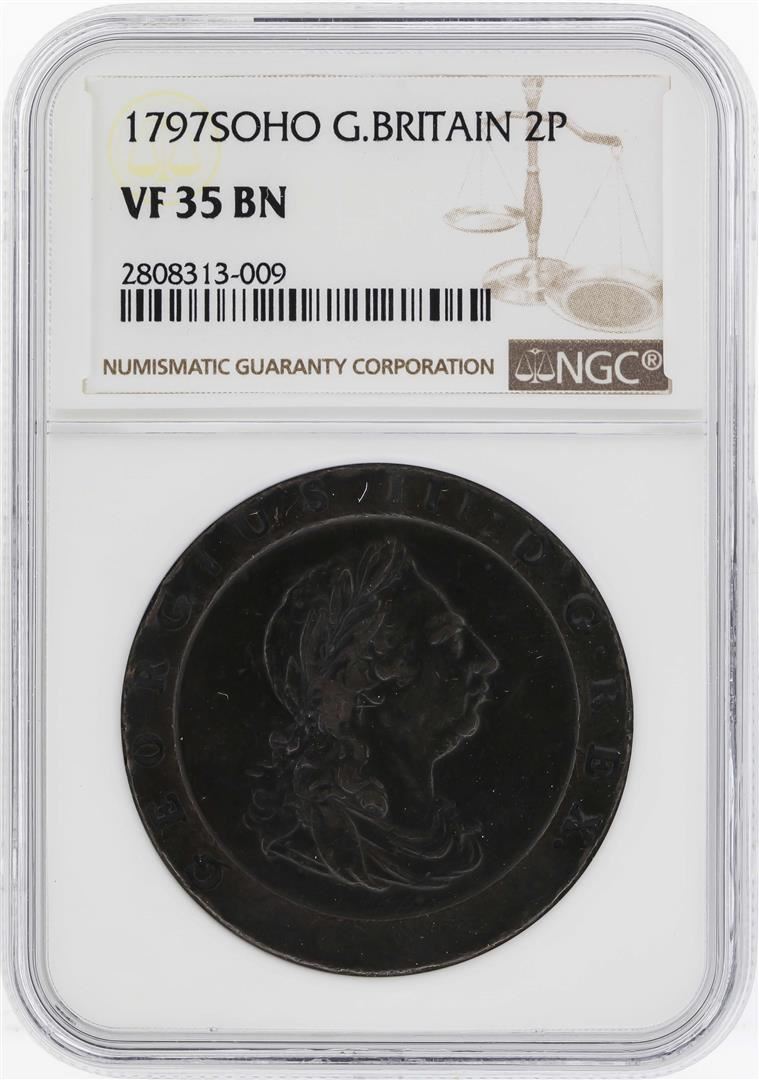 One 1797SOHO Great Britain 2 Pence Coin NGC VF35 BN. NGC Certified.