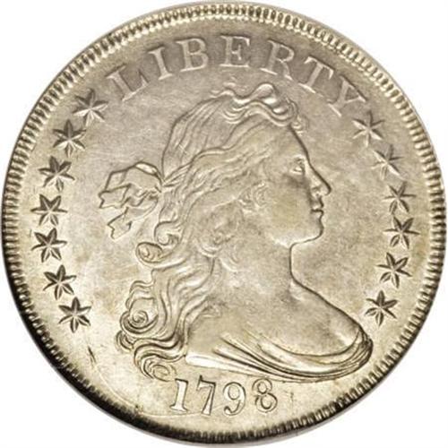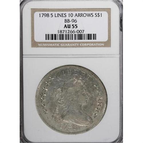<B>1798 $1 Knob 9, 5 Vertical Lines, 10 Arrows, B-6, BB-96, R.3 AU55 NGC.</B></I> B-6b, BB-96, R.3. Die State V. The obverse die is shattered and the reverse die is relapped, now with the two headless sticks entirely absent. While this example and the other B-6 in the present sale are both described as Die State V, this example is a later stage, and should be distinguished as an additional die state.<BR> Lustrous light silver surfaces are accented by splashes of pale gold and iridescent toning. A highly desirable piece despite a few tiny handling marks on each side.<BR><I>From The Queller Family Collection of Silver Dollars.</B></I><BR><BR><b>Shipping:</b> Coins & Currency (<a target="_blank" href="http://www.heritageauctions.com/common/shipping.php">view shipping information</a>)
