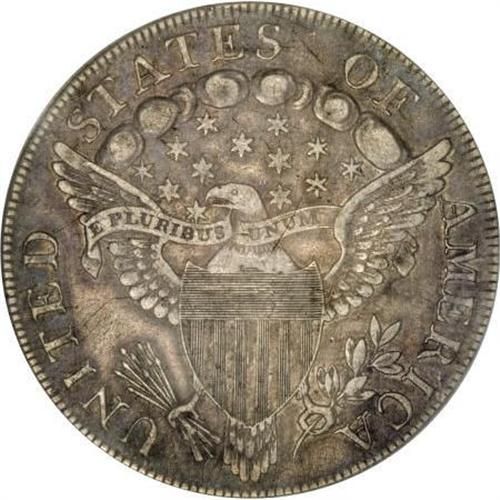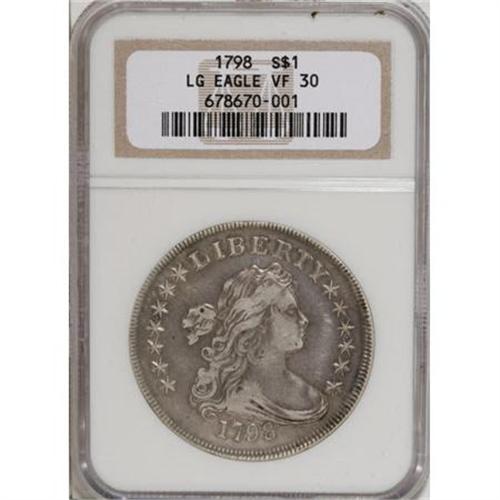 <B>1798 $1 Knob 9, 5 Stripes VF30 NGC.</B></I> B-6, BB-96, R.3. This unblemished early dollar has medium slate-gray and tawny-gold obverse toning, while the slightly deeper reverse has dusky cobalt-blue patina. All letters in E PLURIBUS UNUM are clear, and the shield lines are fully separated. A problem-free 18th century example of this highly contested large silver type.<BR><BR><B>Coin Engraver:</B> Robert Scot<BR><BR><b>Shipping:</b> Coins & Currency (<a target="_blank" href="http://www.heritageauctions.com/common/shipping.php">view shipping information</a>)