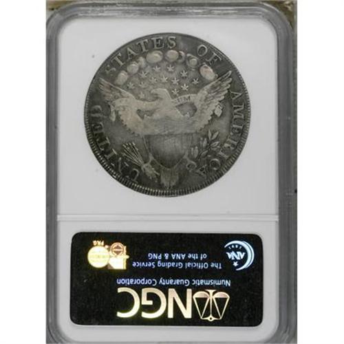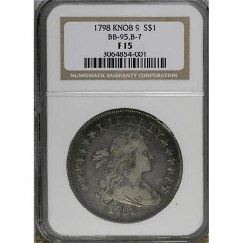 <B>1798 $1 Knob 9 Fine 15 NGC.</B></I> B-7, BB-95, R.5. The slate-gray centers are bounded by dusky gunmetal-gray toning. The eagle's wings retain ample feather detail, and the rims have only occasional moderate imperfections. A few light criss-cross adjustment marks are present on the eagle's shield, as produced.<BR><BR><B>Coin Engraver:</B> Robert Scot<BR><BR><b>Shipping:</b> Coins & Currency (<a target="_blank" href="http://www.heritageauctions.com/common/shipping.php">view shipping information</a>)