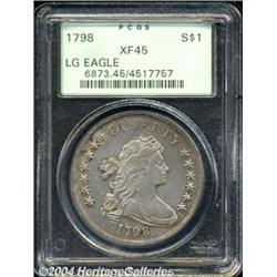 <table><tbody><tr><td><table> <TR><TD width="100%"><TABLE cellSpacing=1 cellPadding=3 width="100%" border=0><TBODY><TR><TD width="100%" bgColor=#79735c><FONT face=arial color=#ffffff size=3><B>Description</B> </FONT></TD></TR><TR><TD width="100%" bgColor=#ffffff><FONT face=arial size=2><B>1798 $1 Knob 9 XF45 PCGS.</B></I> B-3, BB-94, Die State III. One of the scarcer 1798 varieties, distinguished by die dots below the word LIBERTY as well as on the figure of Liberty, combined with an arc star pattern on the reverse. A short die crack between star 2 and the border confirm the later die state. Additional cracks are also noted on the left side of the obverse. Just 150 to 250 BB-94s are estimated to survive. This still-lustrous example is accented in attractive russet hues and shows at least as much detail as the Bowers plate coin. There is an unobtrusive grease stain from Liberty's bust and a short horizontal dig to the left of stars 12 and 13. </FONT></TD></TR></TBODY></TABLE></TD></TR></TBODY></TABLE><BR><A name=PricesRealized></A><TABLE cellSpacing=0 cellPadding=0 width="100%" bgColor=#000000 border=0><TBODY><TR><TD width="100%"><TABLE cellSpacing=1 cellPadding=3 width="100%" border=0><TBODY><TR><TD width="100%" bgColor=#79735c><A name=PR><FONT face=arial color=#ffffff size=3><B>Previous Prices from Heritage Auctions</B> </FONT></A></TD></TR><TR><TD bgColor=#f6f6ed><TABLE cellSpacing=0 cellPadding=0 width="100%" border=1><TBODY><TR><TD align=middle width="33%"><B>Date</B></TD><TD align=middle width="33%"><B>Service</B></TD><TD align=middle width="33%"><B>Price</B></TD></TR><TR bgColor=whitesmoke><TD width="33%"><B>10/30/2001</B></TD><TD width="33%">ANACS</TD><TD width="33%">$1,900.00</TD></TR><TR bgColor=whitesmoke><TD width="33%"><B>01/11/2003</B></TD><TD width="33%">ANACS</TD><TD width="33%">$2,415.00</TD></TR><TR bgColor=whitesmoke><TD width="33%"><B>09/28/2002</B></TD><TD width="33%">NGC</TD><TD width="33%">$2,530.00</TD></TR><TR bgColor=whitesmoke><TD width="33%"><B>02/23/2002</B></TD><TD width="33%">PCGS</TD><TD width="33%">$2,990.00</TD></TR><TR bgColor=whitesmoke><TD width="33%"><B>01/12/2002</B></TD><TD width="33%">ANACS</TD><TD width="33%">$1,955.00</TD></TR><TR bgColor=whitesmoke><TD width="33%"><B>01/12/2002</B></TD><TD width="33%">PCGS</TD><TD width="33%">$3,795.00</TD></TR><TR bgColor=whitesmoke><TD width="33%"><B>10/06/2001</B></TD><TD width="33%">ANACS</TD><TD width="33%">$1,610.00</TD></TR><TR bgColor=whitesmoke><TD width="33%"><B>11/17/2000</B></TD><TD width="33%">PCGS</TD><TD width="33%">$4,025.00</TD></TR><TR bgColor=whitesmoke><TD width="33%"><B>08/13/1999</B></TD><TD width="33%">PCGS</TD><TD width="33%">$1,955.00</TD></TR><TR bgColor=whitesmoke><TD width="33%"><B>06/04/1999</B></TD><TD width="33%">ANACS</TD><TD width="33%">$1,667.50</TD></TR><TR bgColor=whitesmoke><TD width="33%"><B>08/17/1996</B></TD><TD width="33%">ANACS</TD><TD width="33%">$742.50</TD></TR><TR bgColor=whitesmoke><TD width="33%"><B>08/19/1995</B></TD><TD width="33%">NGC</TD><TD width="33%">$962.50</TD></TR><TR bgColor=whitesmoke><TD width="33%"><B>08/19/1995</B></TD><TD width="33%">ANACS</TD><TD width="33%">$1,045.00</TD></TR><TR bgColor=whitesmoke><TD width="33%"><B>06/04/1995</B></TD><TD width="33%">NGC</TD><TD width="33%">$770.00</TD></TR><TR bgColor=whitesmoke><TD width="33%"><B>07/30/1994</B></TD><TD width="33%">NGC</TD><TD width="33%">$880.00</TD></TR><TR bgColor=whitesmoke><TD width="33%"><B>05/01/2001</B></TD><TD width="33%">ANACS</TD><TD width="33%">$2,415.00</TD></TR><TR bgColor=whitesmoke><TD width="33%"><B>03/01/1998</B></TD><TD width="33%">PCGS</TD><TD width="33%">$2,420.00</TD></TR></TBODY></TABLE></TD></TR><TR><TD bgColor=#ffffff><FONT face=arial size=1 ?>PLEASE NOTE: All prices realized reflect the final hammer price PLUS the buyer's premium in auctions that charge a buyer's premium. Each item has a notation at the top of the listing indicating whether that lot included a buyer's premium. Example: A item that sells with a final hammer price of $100 and a 20% buyer's premium will display with a price realized of $120. All information listed is intended to be as accurate as possible, but errors are possible. Please use this guide carefully and inform us of any inaccuracies. </FONT></TD></TR></TBODY></TABLE></TD></TR></TBODY></TABLE><BR><TABLE cellSpacing=0 cellPadding=0 width="100%" bgColor=#000000 border=0><TBODY><TR><TD width="100%"><TABLE cellSpacing=1 cellPadding=3 width="100%" border=0><TBODY><TR><TD width="100%" bgColor=#79735c colSpan=6><FONT face=arial color=#ffffff size=3><B>Price Guide*</B> </FONT></TD></TR><TR bgColor=#f6f6ed><TD align=middle><B>Grade</B> </TD><TD align=middle><B>Coin World<BR>(Trends)</B> </TD><TD align=middle><B>Numismedia<BR>Retail</B> </TD><TD align=middle><B>Numismedia<BR>Wholesale</B> </TD><TD align=middle><B>Coin<BR>Universe</B> </TD><TD align=middle><B>Heritage<BR>Value Index</B> </TD></TR><TR bgColor=#ffffff><TD align=middle>40</TD><TD align=right>$3,000.00</TD><TD align=right>---</TD><TD align=right>$2,125.00</TD><TD align=right>$4,000.00</TD><TD align=right>$2,350.63</TD></TR><TR style="FONT-WEIGHT: bold" bgColor=#cccfdd><TD align=middle>45</TD><TD align=right>$4,500.00</TD><TD align=right>---</TD><TD align=right>---</TD><TD align=right>---</TD><TD align=right>$2,919.48</TD></TR><TR bgColor=#ffffff><TD align=middle>50</TD><TD align=right>$5,500.00</TD><TD align=right>---</TD><TD align=right>$3,850.00</TD><TD align=right>---</TD><TD align=right>$4,073.75</TD></TR><TR bgColor=#ffffff><TD colSpan=6><FONT size=1>*All information listed is intended to be as accurate as possible, but errors are possible. No item may be returned or refused based on this information which is provided as a service to our customers. You should contact each pricing source directly to determine the accuracy of this information. </FONT></TD></TR></TBODY></TABLE></TD></TR></TBODY></TABLE><BR><TABLE cellSpacing=0 cellPadding=0 width="100%" bgColor=#000000 border=0><TBODY><TR><