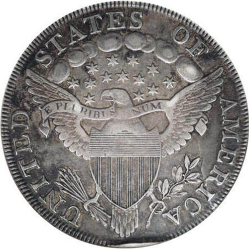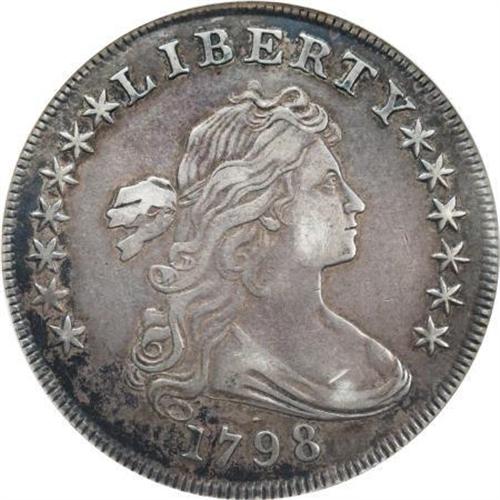 <B>1798 $1 Large Eagle, Wide Date AU53 NGC.</B></I> B-20, BB-102, R.5. Die State IV with a cud at 6 o'clock on the reverse and a heavy die break beneath the right scroll end. The shape of the reverse die undoubtedly contributes to the rarity of B-20. Bowers estimates only 75 to 125 survivors across all grades, only 2 to 4 pieces in AU, and none in Mint State.<BR> This is a splendid Heraldic Eagle dollar without the scratches or rim marks that so often accompany examples of the series. The highpoints are slate-gray, and contrast mildly with the pearl-gray fields and deep blue-gray borders. Expect fierce competition for this better variety example.<BR><BR><B>Coin Engraver:</B> Robert Scot<BR><BR><b>Shipping:</b> Coins & Currency (<a target="_blank" href="http://www.heritageauctions.com/common/shipping.php">view shipping information</a>)
