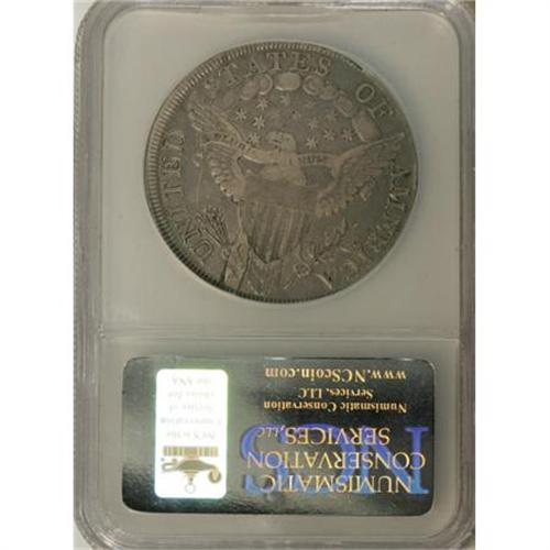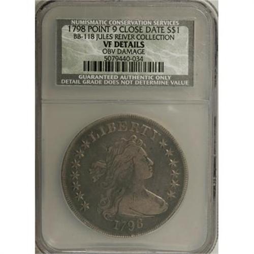 1798 S$1 Large Eagle--Obverse Damage--NCS. VF Details. Point 9 Close Date. Ex: Reiver. B-28, BB-118, R.3. Digit 8 out of position, high and leaning slightly right; point of leaf below right half of C. The obverse damage consists of some light vertical and horizontal scratches in the right obverse field, and a couple of minor edge file marks, one on the obverse, another on the reverse. Olive-gray patina graces the moderately worn surfaces.<BR><BR><B>Coin Engraver:</B> Robert Scot<BR><BR><b>Shipping:</b> Coins & Currency (<a target="_blank" href="http://www.heritageauctions.com/common/shipping.php">view shipping information</a>)