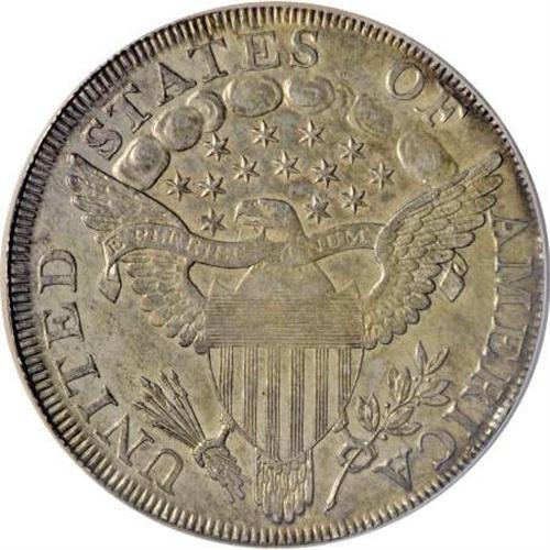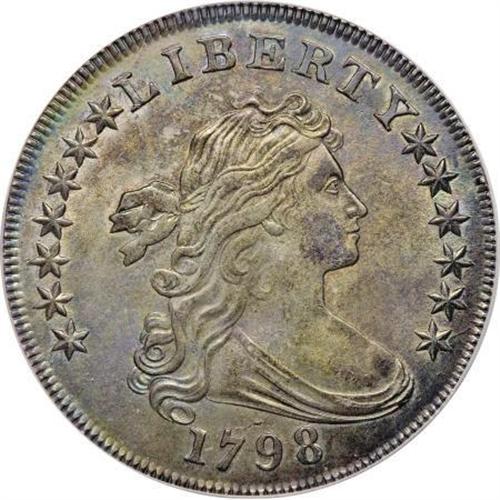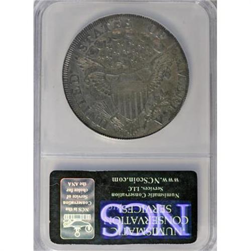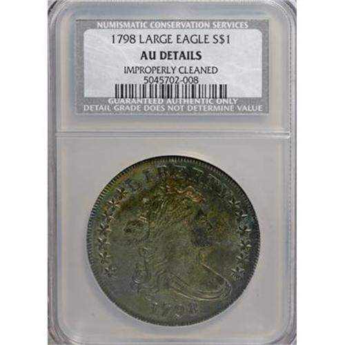 <B>1798 $1 Large Eagle--Improperly Cleaned--NCS. AU Details.</B></I> B-21, BB-107, R.5. Die State II. This is the usual die state for B-21, perhaps the only existing die state. The obverse has a small die chip between the 9 and the drapery, with a short crack extending toward the 7. The reverse is cracked from the right wing tip to the tops of AM and the border.<BR> Although cleaned and retoned with dark iridescence on the obverse and lighter gold on the reverse, the surfaces retain considerable luster. Slight weakness of the strike is evident on the centers, with the balance boldly defined. Virtually Mint State sharpness with only a trace of highpoint wear. Stack's described this coin in their catalog as:<BR> "1798 B.13 (R-3). Pointed 9. Choice About Uncirculated, and on the cusp of a full Mint State grade. The obverse is awash in beautiful jade, olive and deep gray toning, bathing decidedly lustrous surfaces. The reverse is much lighter in tone, with gold and peach joining light olive amidst frosty mint luster. The strike is fairly strong for the issue, with some minor weakness noted at the dead center of each side as well as at Miss Liberty's ribbon tie. Here is an overall very attractive specimen of this variety that would make a fine addition to a date or variety set of Silver Dollars."<BR><I>Ex: Stack's (5/2006), lot 1840.</B></I><BR><I>From The Queller Family Collection of Silver Dollars.</B></I><BR><BR><b>Shipping:</b> Coins & Currency (<a target="_blank" href="http://www.heritageauctions.com/common/shipping.php">view shipping information</a>)