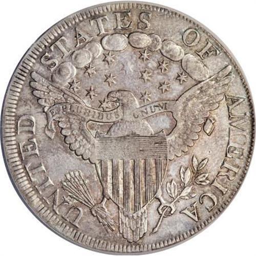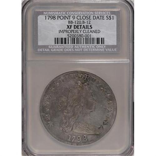 <B>1798 $1 Large Eagle, Pointed 9--Improperly Cleaned--NCS. XF Details.</B></I> B-12, BB-120, R.4. A sharply detailed example of this scarce die marriage. Minutely granular along the right reverse border, and slightly subdued by dove-gray toning, but remaining luster is noticeable, and there are no relevant marks.<BR><BR><B>Coin Engraver:</B> Robert Scot<BR><BR><b>Shipping:</b> Coins & Currency (<a target="_blank" href="http://www.heritageauctions.com/common/shipping.php">view shipping information</a>)