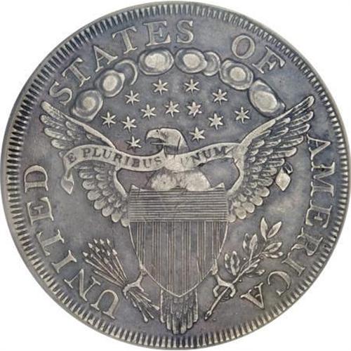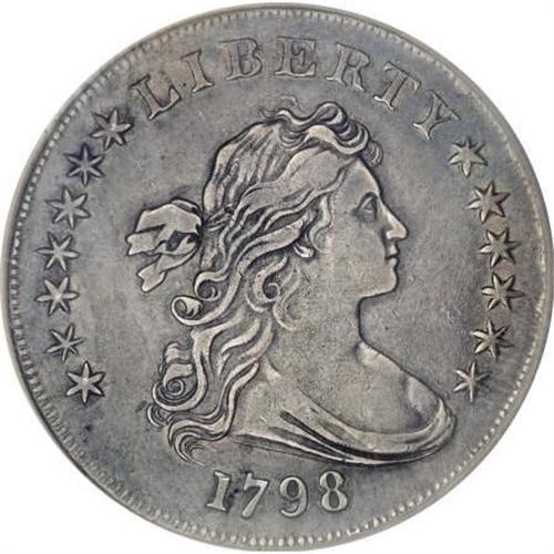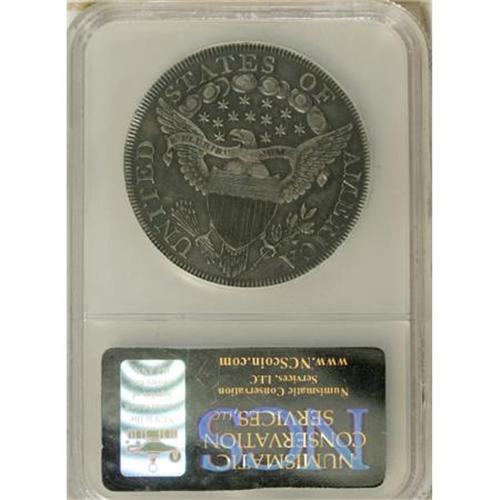 <B>1798 $1 Large Eagle--Improperly Cleaned--NCS. XF Details.</B></I> B-10, BB-109, R.4. Die State III. An interesting point for study is the relative border size on the obverse and the reverse. Border dentils on the obverse are narrow around the entire circumference, in some places almost completely missing. The reverse dentils are complete, and much wider around nearly the entire coin. The comparison indicates that the obverse field diameter was slightly larger than the reverse field diameter.<B><BR> </B></I>Deep gray surfaces on both sides accompany lighter silver-gray on the highpoints of the devices. The surfaces have the usual quota of tiny abrasions that are consistent with the grade, including a few tiny rim bruises at 3 o'clock on the obverse. Perhaps cleaned as stated by NCS, but still attractive and desirable.<BR><I>From The Queller Family Collection of Silver Dollars.</B></I><BR><BR><b>Shipping:</b> Coins & Currency (<a target="_blank" href="http://www.heritageauctions.com/common/shipping.php">view shipping information</a>)