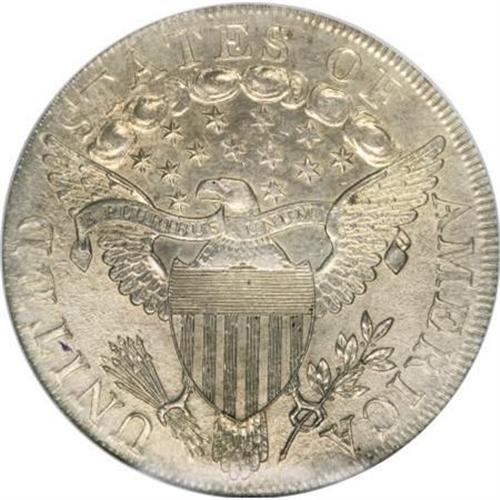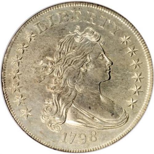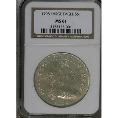 <B>1798 $1 Large Eagle MS61 NGC.</B></I> B-27, BB-113, R.2. The following diagnostics confirm the variety: the 8 in the date is struck much too high and leaning to the right at the top, the highest wave of hair is incomplete, a tiny die chip is visible near an inside point of star 12, and a reverse die crack extends from the ES of STATES through the tops of OF through the right wing tip to the border above the first A in AMERICA.<BR> A solid strike imparts crisp definition to the design elements, and barely discernible wisps of faint tan visit bright surfaces. A few light handling marks occur over each side.<BR><BR><B>Coin Engraver:</B> Robert Scot<BR><BR><b>Shipping:</b> Coins & Currency (<a target="_blank" href="http://www.heritageauctions.com/common/shipping.php">view shipping information</a>)
