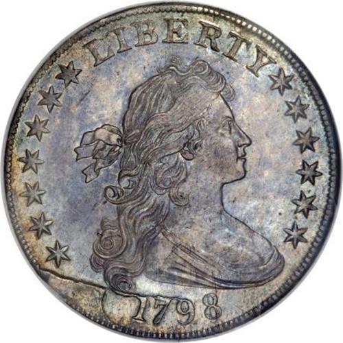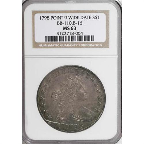 <B>1798 $1 Large Eagle, Pointed 9 MS63 NGC.</B></I> B-16, BB-110, R.6. Die State IV. <B>Terminal Die State.</B></I> The die state is later than the last state described in the Bowers <I>Silver Dollar Encyclopedia. </B></I>It is interesting that this example, with the full rim break at the date, was actually described in the list of Notable Specimens, but the die state was not recorded in the Die States section of that reference. It is probably the only known example with a full rim break behind the lowest hair curl, and it is just a matter of chance that it survived in such amazing condition. Few if any could have been struck after this piece. As both the finest known example of B-16, and the terminal die state, this amazing dollar ranks among the most highly desired coins in the Queller Family Collection. In his update of the Bolender reference, Jules Reiver mentioned the presence of a tiny cud below star 1, but described nothing of the magnitude seen here. Because of the heavy rim break, the obverse was taken out of service, but the reverse remained in use for three additional varieties.<BR> Although a few border dentils are weak, the balance of design definition on both sides is bold. Full mint luster is visible beneath deep heather, gold, and blue. The surfaces are impressive, with only a tiny reverse rim tick near the D to serve as a pedigree marker. This is an amazing piece that will undoubtedly be a prized possession of its next owner.<BR><I>Ex: H. Roland Willasch (Superior, 5/1990), lot 492; Stack's (10/1993), lot 733.</B></I><BR><I>From The Queller Family Collection of Silver Dollars.</B></I><BR><BR><b>Shipping:</b> Coins & Currency (<a target="_blank" href="http://www.heritageauctions.com/common/shipping.php">view shipping information</a>)