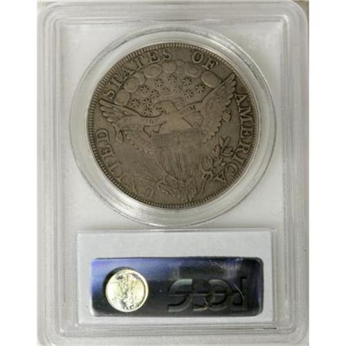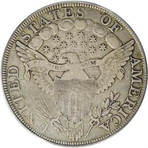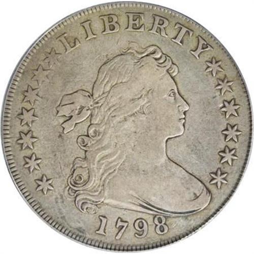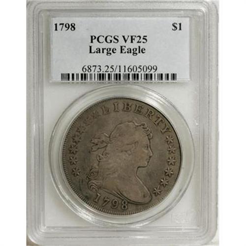 <B>1798 $1 Large Eagle VF25 PCGS.</B></I> B-22, BB-104, R.4. Wide date, with the 8 firmly united with the bust, star 7 points directly at the lower left serif of L, there are five berries on the branch, and a leaf point is below the lower left corner of the I in AMERICA. There is also a die break from the milling down through the right part of the E in STATES. Medium gray patina covers relatively smooth surfaces, and nice dentil shows fro the grade. A toned over shallow linear mark is located in the lower right obverse quadrant.<BR><BR><B>Coin Engraver:</B> Robert Scot<BR><BR><b>Shipping:</b> Coins & Currency (<a target="_blank" href="http://www.heritageauctions.com/common/shipping.php">view shipping information</a>)