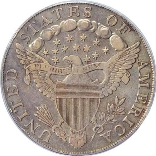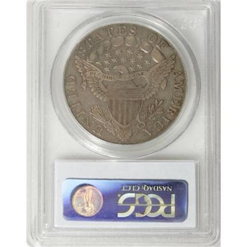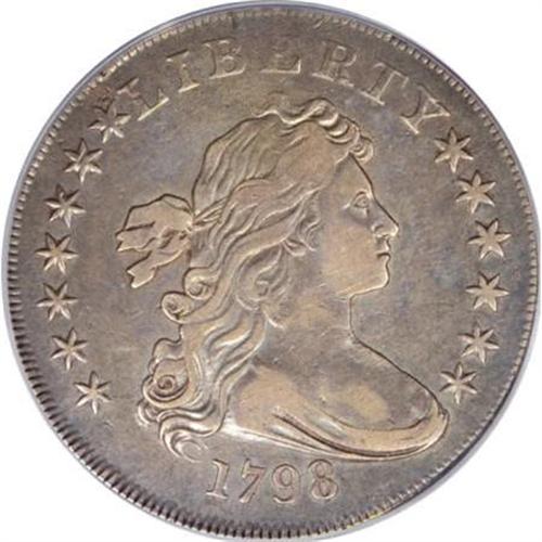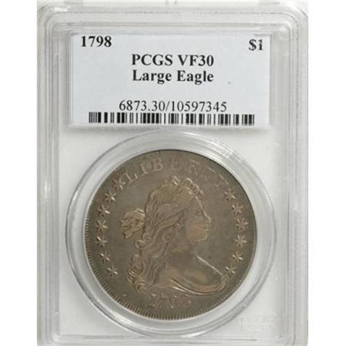 <B>1798 $1 Large Eagle VF30 PCGS.</B></I> B-9, BB-121, R.4. Bowers-Borckardt Die State II. The "Amateur's Diecutter's Reverse" variety with awkwardly arranged stars above the eagle. Gunmetal-blue and sun-gold undertones emerge from this deep gray early dollar. Careful perusal with a lens fails to locate any consequential marks.<BR><BR><B>Coin Engraver:</B> Robert Scot<BR><BR><b>Shipping:</b> Coins & Currency (<a target="_blank" href="http://www.heritageauctions.com/common/shipping.php">view shipping information</a>)