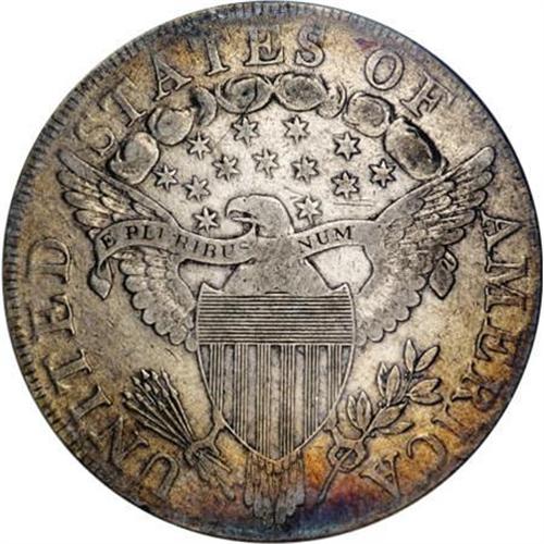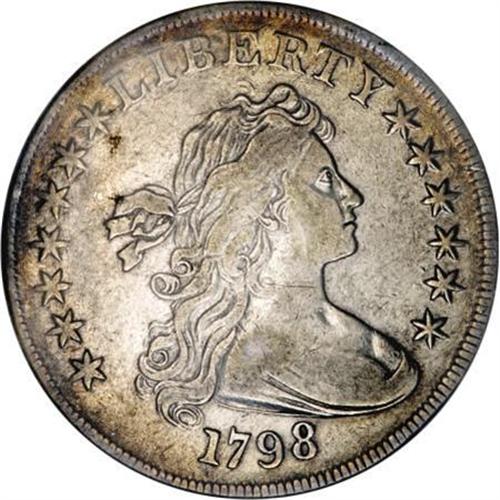 <B>1798 $1 Large Eagle VF35 ANACS.</B></I> B-27, BB-113, R.2. Luster peers from Liberty's hair, the eagle's wings, and other protected regions. Liberty's cheek and shoulder exhibit moderate wear. Both sides display light gold toning, and the reverse near 6 o'clock offers blushes of navy-blue and lilac patina. Marks are minor given the VF35 grade.<BR><BR><B>Coin Engraver:</B> Robert Scot<BR><BR><b>Shipping:</b> Coins & Currency (<a target="_blank" href="http://www.heritageauctions.com/common/shipping.php">view shipping information</a>)
