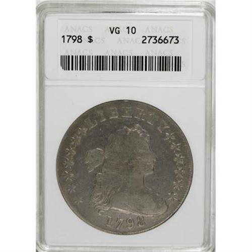 <B>1798 $1 Wide Date VG10 ANACS.</B></I> B-23, BB-105, R.3. On this variety, the 8 in the date firmly touches the bust, the 7th star points directly at the lower left serif end of L in LIBERTY, there are five small berries on the branch, the two above closest together, and the leaf point is under the left foot of I in AMERICA. Just a few light circulation marks are visible on the light gray surfaces, with some semi-circular toning streaks on the upper reverse. <B><BR></B></I><I>From The Beau Clerc Collection.</B></I><BR><BR><B>Coin Engraver:</B> Robert Scot<BR><BR><b>Shipping:</b> Coins & Currency (<a target="_blank" href="http://www.heritageauctions.com/common/shipping.php">view shipping information</a>)