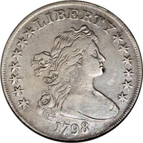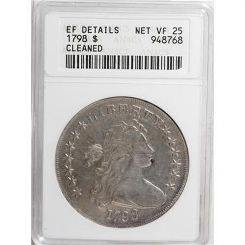 <B>1798 $1 Large Eagle--Cleaned--ANACS. XF Details, Net VF25.</B></I> B-31, BB-115, R.5. A slightly wavy ivory-gray example of this seldom-encountered Bolender variety. The portrait is hairlined, and the upper reverse is typically struck, but there are no relevant marks. In 1993, Bowers wrote that B-115 "is one of the more elusive issues of the year. ... Most are in lower grades."<BR><I>From The Casa Becca del Norté Collection.</B></I><BR><BR><B>Coin Engraver:</B> Robert Scot<BR><BR><b>Shipping:</b> Coins & Currency (<a target="_blank" href="http://www.heritageauctions.com/common/shipping.php">view shipping information</a>)
