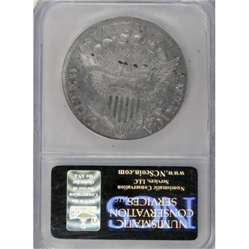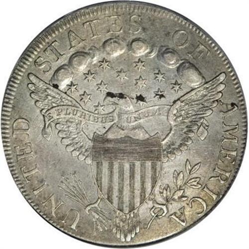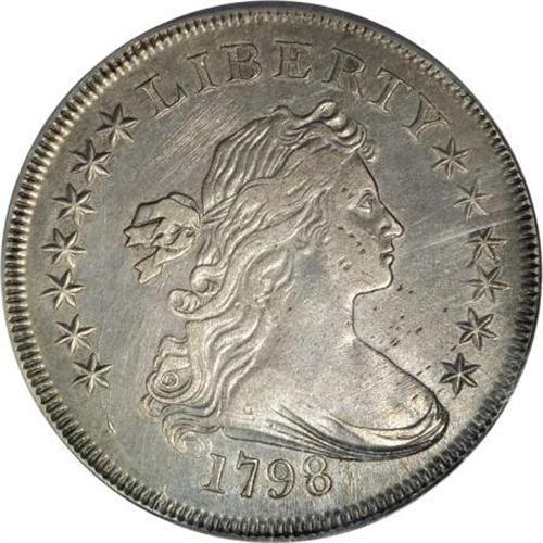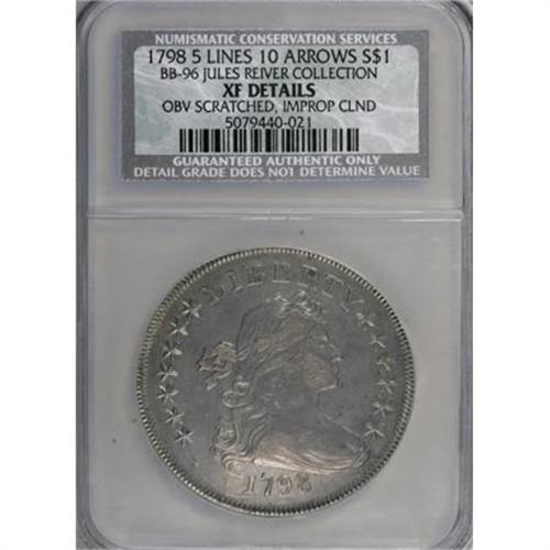 1798 S$1 Five Stripes--Obverse Scratched, Improperly Cleaned--NCS. XF Details. Lines 10 Arrows. Ex: Jules Reiver Collection. B-6, BB-96, R.2. Comma shaped die flaw after date; Five vertical shield lines, 10 arrows. Reiver die state c. Bowers-Borckardt die state V. This is the Reiver plate coin for the obverse of this variety. Both the obverse and reverse show numerous tiny pin scratches when examined with a strong loupe, and there is minor verdigris near the center of the reverse. On the obverse we note a few nicks on Liberty's face and there are some surface pits in the field above Liberty's bust. The reverse die was lapped by the time this one was struck, disconnecting the upper berries from the branch. Starting to retone a bit toward a more natural silver gray color. Ever popular for the Knobbed 9 in the date, and the general scarcity of the variety. <BR>This coin was purchased from the W. Earl Spies sale in 1974. At that time this was coin listed as a B-32, but it is really just a later lapped die state of 1798 B-6.<BR><I>Ex: Stack's W. Earl Spies Sale (December, 1974), lot 110.</B></I> 3<BR><BR><B>Coin Engraver:</B> Robert Scot<BR><BR><b>Shipping:</b> Coins & Currency (<a target="_blank" href="http://www.heritageauctions.com/common/shipping.php">view shipping information</a>)